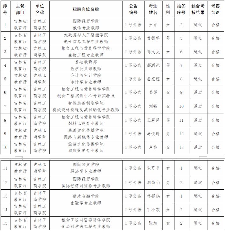 按照《2026年吉林工商学院公开招聘高层次人才及博士人才公告(1号)》的有关规定,经报名资格审核、面试考核、体检、考察、政审等环节,确定王乔等15名同志为2026年吉林工商学院公开招聘拟聘用人员。现按照法定程序面向社会进行公示,公示期5个工作日,自2026年4月27日-2026年5月6日。如有异议,请拨打电话0431-82306107。